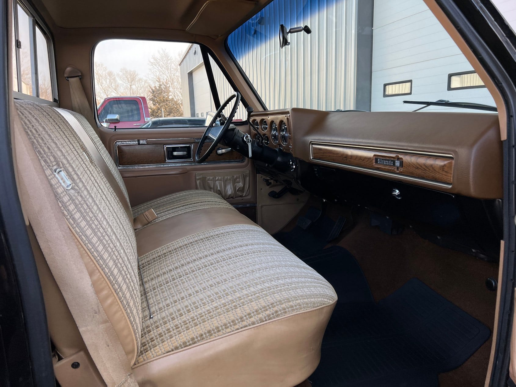 Inside, the interior is original and exceptionally well-preserved, with a tilt steering column and factory cruise control adding comfort and convenience. The truck features power steering and brakes for a smooth driving experience, along with full gauges and a clock for essential information at a glance.